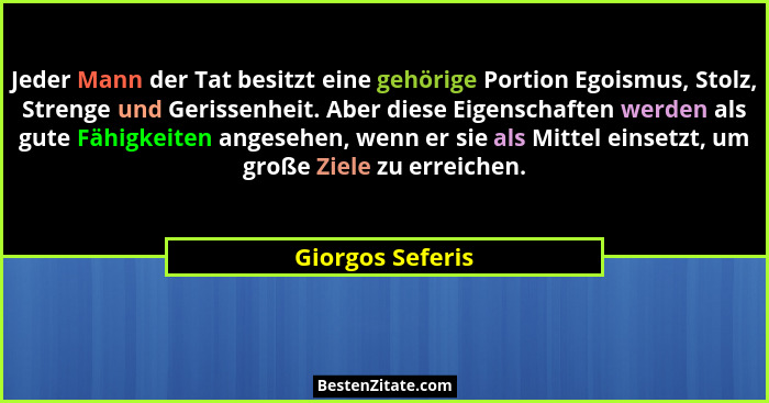 Jeder Mann der Tat besitzt eine gehörige Portion Egoismus, Stolz, Strenge und Gerissenheit. Aber diese Eigenschaften werden als gute Fähigkeiten angesehen, wenn er sie als Mittel einsetzt, um große Ziele zu erreichen.