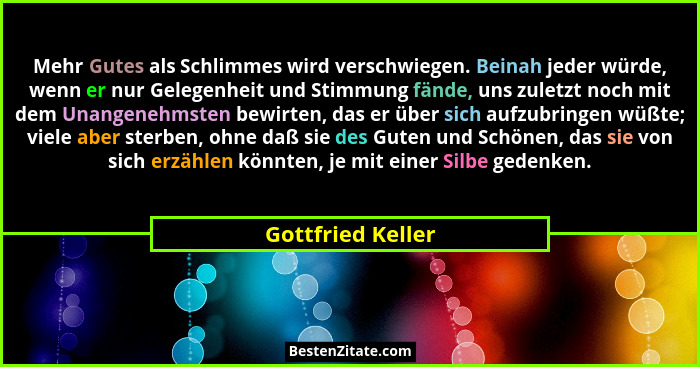Mehr Gutes als Schlimmes wird verschwiegen. Beinah jeder würde, wenn er nur Gelegenheit und Stimmung fände, uns zuletzt noch mit dem Unangenehmsten bewirten, das er über sich aufzubringen wüßte; viele aber sterben, ohne daß sie des Guten und Schönen, das sie von sich erzählen könnten, je mit einer Silbe gedenken.