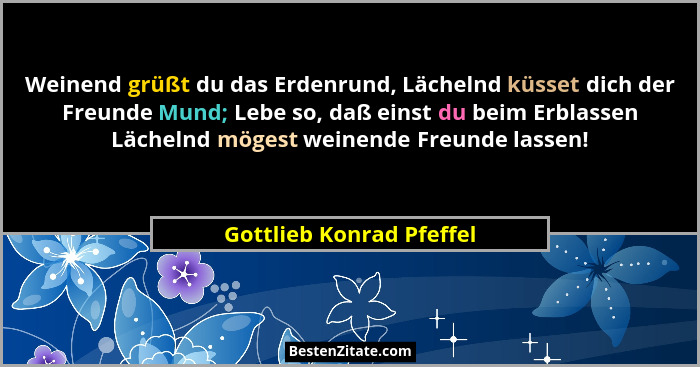 Weinend grüßt du das Erdenrund, Lächelnd küsset dich der Freunde Mund; Lebe so, daß einst du beim Erblassen Lächelnd mögest weinende Freunde lassen!