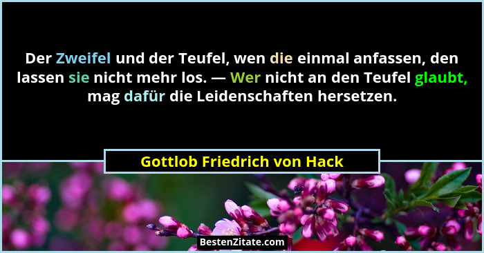Der Zweifel und der Teufel, wen die einmal anfassen, den lassen sie nicht mehr los. — Wer nicht an den Teufel glaubt, mag dafür die Leidenschaften hersetzen.