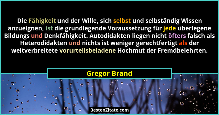 Die Fähigkeit und der Wille, sich selbst und selbständig Wissen anzueignen, ist die grundlegende Voraussetzung für jede überlegene Bildungs und Denkfähigkeit. Autodidakten liegen nicht öfters falsch als Heterodidakten und nichts ist weniger gerechtfertigt als der weitverbreitete vorurteilsbeladene Hochmut der Fremdbelehrten.