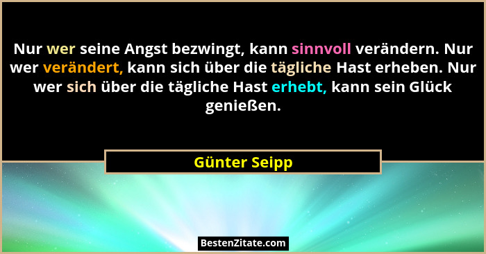 Nur wer seine Angst bezwingt, kann sinnvoll verändern. Nur wer verändert, kann sich über die tägliche Hast erheben. Nur wer sich über die tägliche Hast erhebt, kann sein Glück genießen.