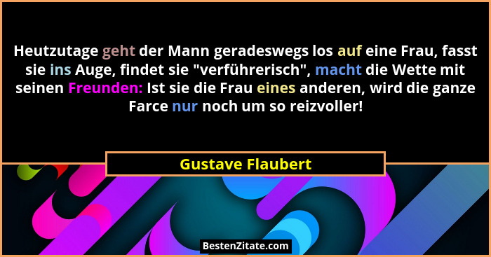 Heutzutage geht der Mann geradeswegs los auf eine Frau, fasst sie ins Auge, findet sie "verführerisch", macht die Wette mit seinen Freunden: Ist sie die Frau eines anderen, wird die ganze Farce nur noch um so reizvoller!