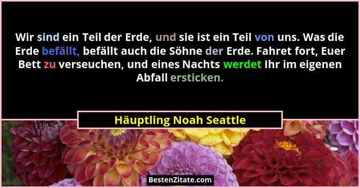 Wir sind ein Teil der Erde, und sie ist ein Teil von uns. Was die Erde befällt, befällt auch die Söhne der Erde. Fahret fort, Euer Bett zu verseuchen, und eines Nachts werdet Ihr im eigenen Abfall ersticken.