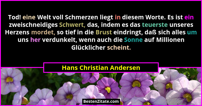 Tod! eine Welt voll Schmerzen liegt in diesem Worte. Es ist ein zweischneidiges Schwert, das, indem es das teuerste unseres Herzens mordet, so tief in die Brust eindringt, daß sich alles um uns her verdunkelt, wenn auch die Sonne auf Millionen Glücklicher scheint.