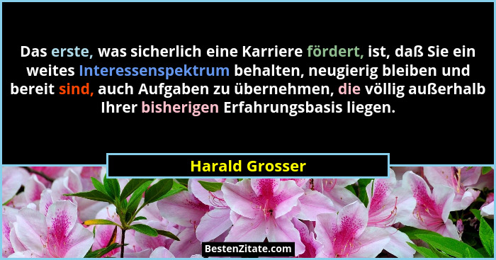 Das erste, was sicherlich eine Karriere fördert, ist, daß Sie ein weites Interessenspektrum behalten, neugierig bleiben und bereit sind, auch Aufgaben zu übernehmen, die völlig außerhalb Ihrer bisherigen Erfahrungsbasis liegen.