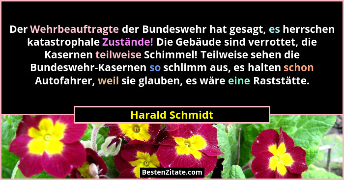 Der Wehrbeauftragte der Bundeswehr hat gesagt, es herrschen katastrophale Zustände! Die Gebäude sind verrottet, die Kasernen teilweise Schimmel! Teilweise sehen die Bundeswehr-Kasernen so schlimm aus, es halten schon Autofahrer, weil sie glauben, es wäre eine Raststätte.