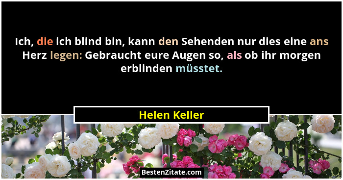 Ich, die ich blind bin, kann den Sehenden nur dies eine ans Herz legen: Gebraucht eure Augen so, als ob ihr morgen erblinden müsstet.