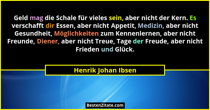 Geld mag die Schale für vieles sein, aber nicht der Kern. Es verschafft dir Essen, aber nicht Appetit, Medizin, aber nicht Gesundheit, Möglichkeiten zum Kennenlernen, aber nicht Freunde, Diener, aber nicht Treue, Tage der Freude, aber nicht Frieden und Glück.