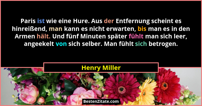 Paris ist wie eine Hure. Aus der Entfernung scheint es hinreißend, man kann es nicht erwarten, bis man es in den Armen hält. Und fünf Minuten später fühlt man sich leer, angeekelt von sich selber. Man fühlt sich betrogen.