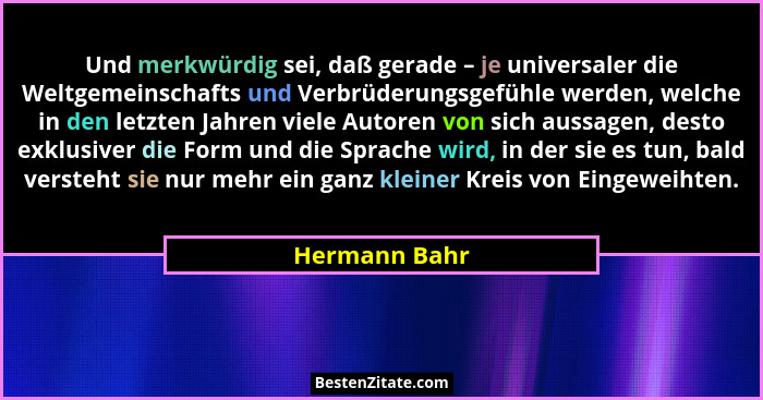 Und merkwürdig sei, daß gerade – je universaler die Weltgemeinschafts und Verbrüderungsgefühle werden, welche in den letzten Jahren viele Autoren von sich aussagen, desto exklusiver die Form und die Sprache wird, in der sie es tun, bald versteht sie nur mehr ein ganz kleiner Kreis von Eingeweihten.
