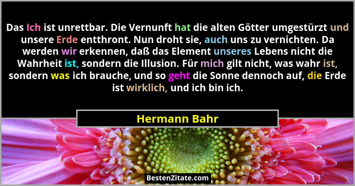 Das Ich ist unrettbar. Die Vernunft hat die alten Götter umgestürzt und unsere Erde entthront. Nun droht sie, auch uns zu vernichten. Da werden wir erkennen, daß das Element unseres Lebens nicht die Wahrheit ist, sondern die Illusion. Für mich gilt nicht, was wahr ist, sondern was ich brauche, und so geht die Sonne dennoch auf, die Erde ist wirklich, und ich bin ich.