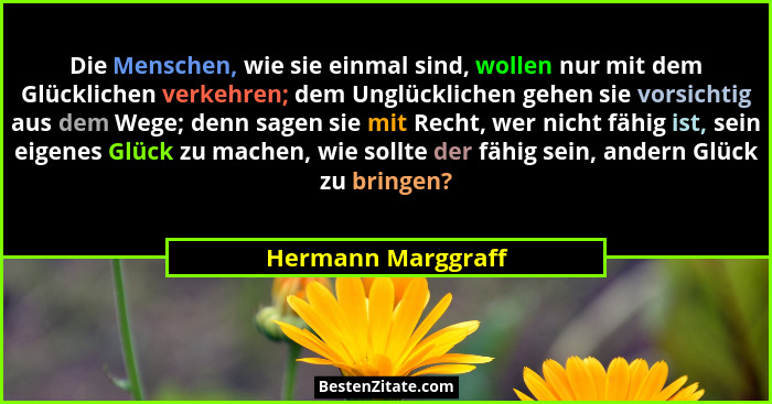 Die Menschen, wie sie einmal sind, wollen nur mit dem Glücklichen verkehren; dem Unglücklichen gehen sie vorsichtig aus dem Wege; denn sagen sie mit Recht, wer nicht fähig ist, sein eigenes Glück zu machen, wie sollte der fähig sein, andern Glück zu bringen?