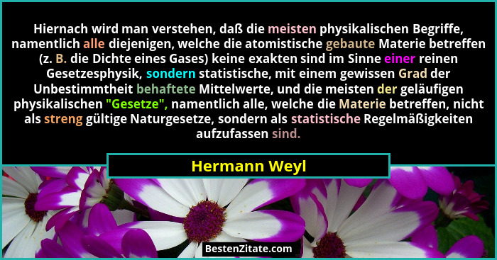 Hiernach wird man verstehen, daß die meisten physikalischen Begriffe, namentlich alle diejenigen, welche die atomistische gebaute Materie betreffen (z. B. die Dichte eines Gases) keine exakten sind im Sinne einer reinen Gesetzesphysik, sondern statistische, mit einem gewissen Grad der Unbestimmtheit behaftete Mittelwerte, und die meisten der geläufigen physikalischen "Gesetze", namentlich alle, welche die Materie betreffen, nicht als streng gültige Naturgesetze, sondern als statistische Regelmäßigkeiten aufzufassen sind.