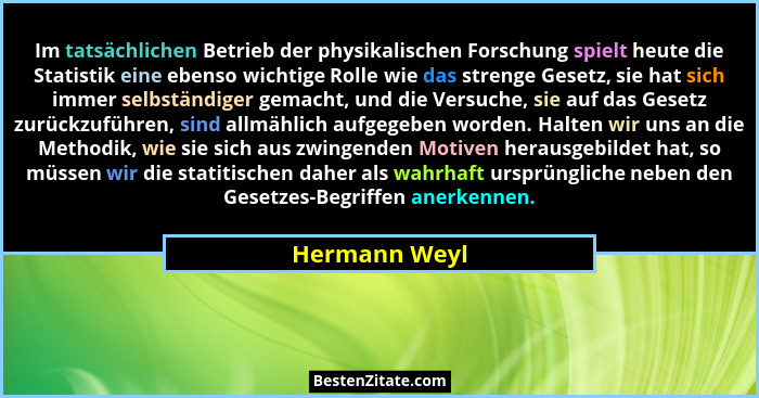 Im tatsächlichen Betrieb der physikalischen Forschung spielt heute die Statistik eine ebenso wichtige Rolle wie das strenge Gesetz, sie hat sich immer selbständiger gemacht, und die Versuche, sie auf das Gesetz zurückzuführen, sind allmählich aufgegeben worden. Halten wir uns an die Methodik, wie sie sich aus zwingenden Motiven herausgebildet hat, so müssen wir die statitischen daher als wahrhaft ursprüngliche neben den Gesetzes-Begriffen anerkennen.
