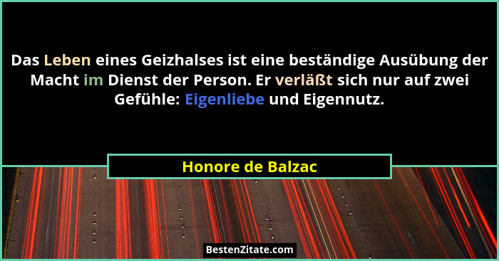 Das Leben eines Geizhalses ist eine beständige Ausübung der Macht im Dienst der Person. Er verläßt sich nur auf zwei Gefühle: Eigenliebe und Eigennutz.