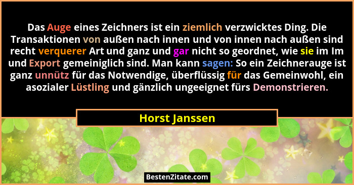 Das Auge eines Zeichners ist ein ziemlich verzwicktes Ding. Die Transaktionen von außen nach innen und von innen nach außen sind recht verquerer Art und ganz und gar nicht so geordnet, wie sie im Im und Export gemeiniglich sind. Man kann sagen: So ein Zeichnerauge ist ganz unnütz für das Notwendige, überflüssig für das Gemeinwohl, ein asozialer Lüstling und gänzlich ungeeignet fürs Demonstrieren.