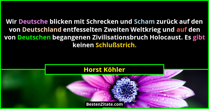 Wir Deutsche blicken mit Schrecken und Scham zurück auf den von Deutschland entfesselten Zweiten Weltkrieg und auf den von Deutschen begangenen Zivilisationsbruch Holocaust. Es gibt keinen Schlußstrich.
