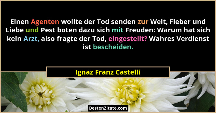 Einen Agenten wollte der Tod senden zur Welt, Fieber und Liebe und Pest boten dazu sich mit Freuden: Warum hat sich kein Arzt, also fragte der Tod, eingestellt? Wahres Verdienst ist bescheiden.