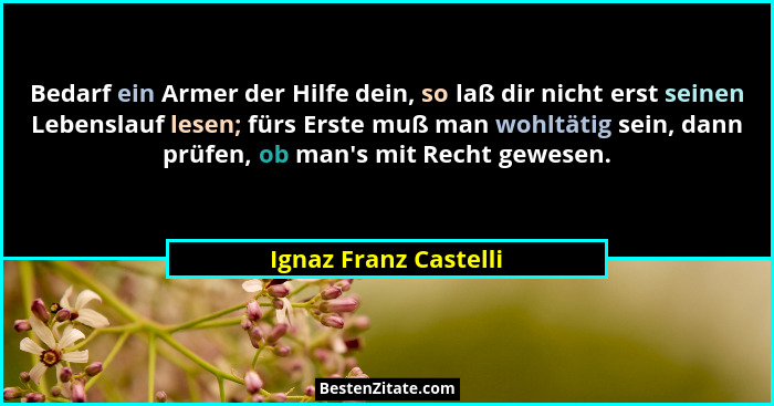Bedarf ein Armer der Hilfe dein, so laß dir nicht erst seinen Lebenslauf lesen; fürs Erste muß man wohltätig sein, dann prüfen, ob man's mit Recht gewesen.
