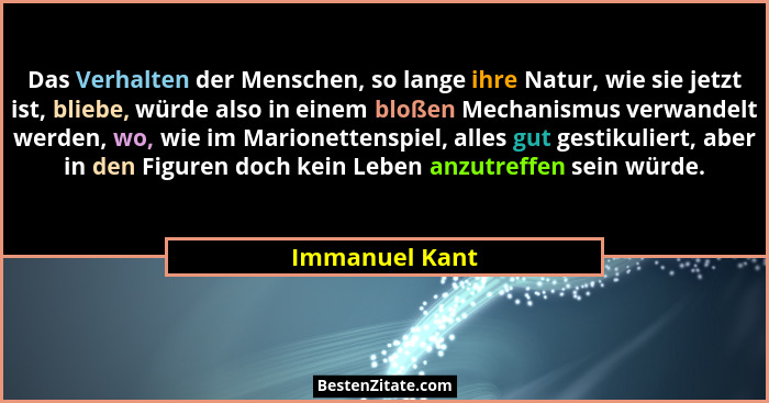 Das Verhalten der Menschen, so lange ihre Natur, wie sie jetzt ist, bliebe, würde also in einem bloßen Mechanismus verwandelt werden, wo, wie im Marionettenspiel, alles gut gestikuliert, aber in den Figuren doch kein Leben anzutreffen sein würde.
