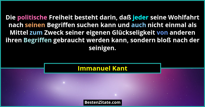 Die politische Freiheit besteht darin, daß jeder seine Wohlfahrt nach seinen Begriffen suchen kann und auch nicht einmal als Mittel zum Zweck seiner eigenen Glückseligkeit von anderen ihren Begriffen gebraucht werden kann, sondern bloß nach der seinigen.