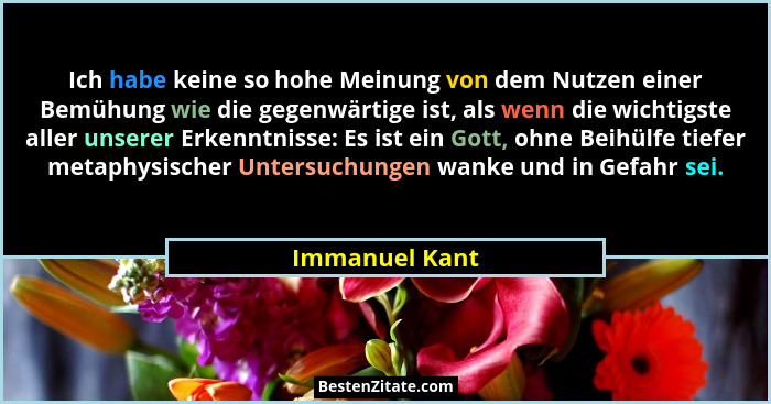 Ich habe keine so hohe Meinung von dem Nutzen einer Bemühung wie die gegenwärtige ist, als wenn die wichtigste aller unserer Erkenntnisse: Es ist ein Gott, ohne Beihülfe tiefer metaphysischer Untersuchungen wanke und in Gefahr sei.