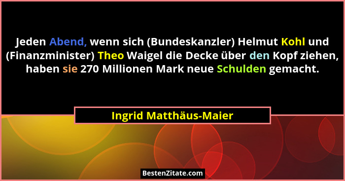 Jeden Abend, wenn sich (Bundeskanzler) Helmut Kohl und (Finanzminister) Theo Waigel die Decke über den Kopf ziehen, haben sie 270 Millionen Mark neue Schulden gemacht.