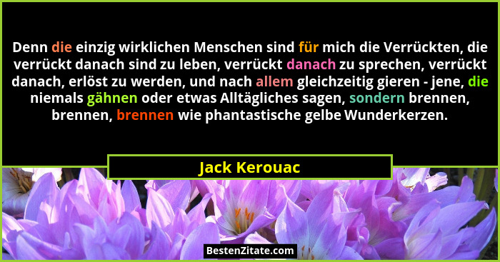 Denn die einzig wirklichen Menschen sind für mich die Verrückten, die verrückt danach sind zu leben, verrückt danach zu sprechen, verrückt danach, erlöst zu werden, und nach allem gleichzeitig gieren - jene, die niemals gähnen oder etwas Alltägliches sagen, sondern brennen, brennen, brennen wie phantastische gelbe Wunderkerzen.