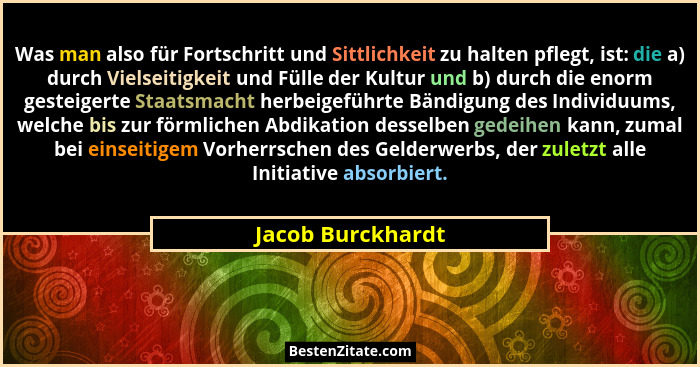 Was man also für Fortschritt und Sittlichkeit zu halten pflegt, ist: die a) durch Vielseitigkeit und Fülle der Kultur und b) durch die enorm gesteigerte Staatsmacht herbeigeführte Bändigung des Individuums, welche bis zur förmlichen Abdikation desselben gedeihen kann, zumal bei einseitigem Vorherrschen des Gelderwerbs, der zuletzt alle Initiative absorbiert.