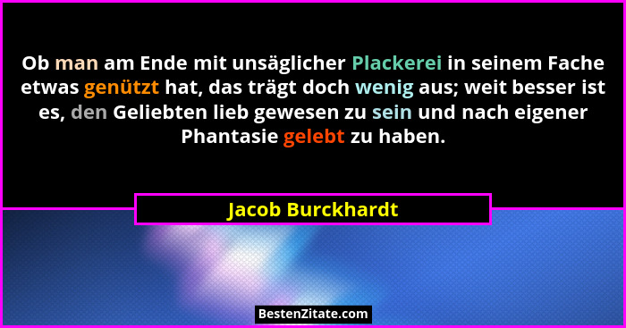 Ob man am Ende mit unsäglicher Plackerei in seinem Fache etwas genützt hat, das trägt doch wenig aus; weit besser ist es, den Geliebten lieb gewesen zu sein und nach eigener Phantasie gelebt zu haben.