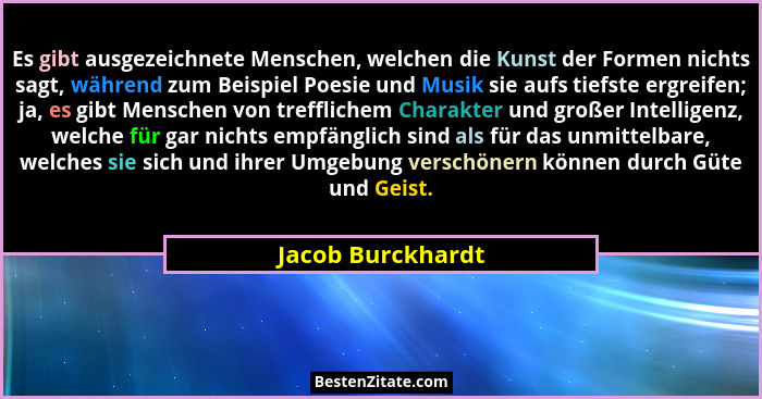 Es gibt ausgezeichnete Menschen, welchen die Kunst der Formen nichts sagt, während zum Beispiel Poesie und Musik sie aufs tiefste ergreifen; ja, es gibt Menschen von trefflichem Charakter und großer Intelligenz, welche für gar nichts empfänglich sind als für das unmittelbare, welches sie sich und ihrer Umgebung verschönern können durch Güte und Geist.