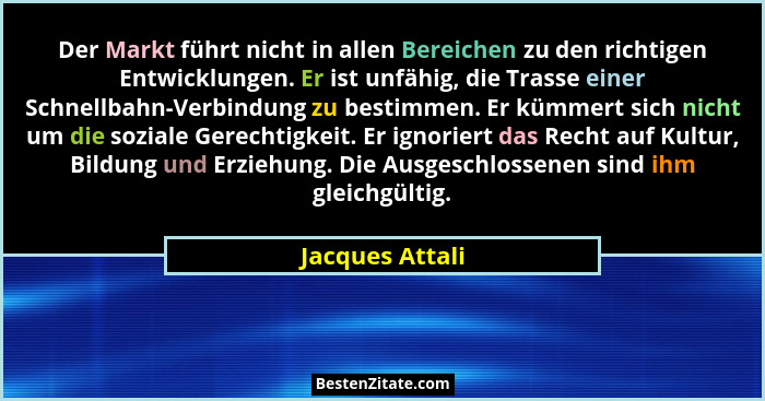 Der Markt führt nicht in allen Bereichen zu den richtigen Entwicklungen. Er ist unfähig, die Trasse einer Schnellbahn-Verbindung zu bestimmen. Er kümmert sich nicht um die soziale Gerechtigkeit. Er ignoriert das Recht auf Kultur, Bildung und Erziehung. Die Ausgeschlossenen sind ihm gleichgültig.