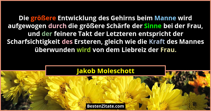 Die größere Entwicklung des Gehirns beim Manne wird aufgewogen durch die größere Schärfe der Sinne bei der Frau, und der feinere Takt der Letzteren entspricht der Scharfsichtigkeit des Ersteren, gleich wie die Kraft des Mannes überwunden wird von dem Liebreiz der Frau.