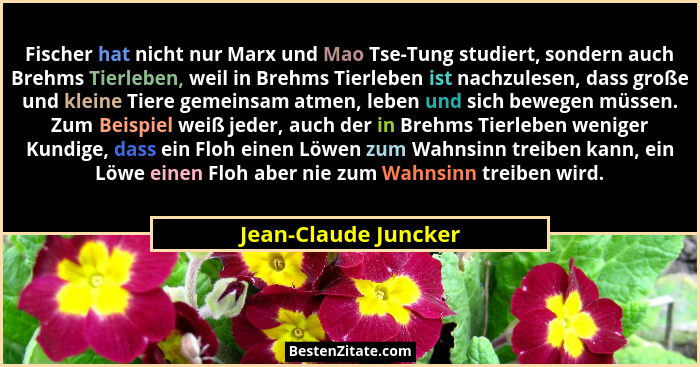 Fischer hat nicht nur Marx und Mao Tse-Tung studiert, sondern auch Brehms Tierleben, weil in Brehms Tierleben ist nachzulesen, dass große und kleine Tiere gemeinsam atmen, leben und sich bewegen müssen. Zum Beispiel weiß jeder, auch der in Brehms Tierleben weniger Kundige, dass ein Floh einen Löwen zum Wahnsinn treiben kann, ein Löwe einen Floh aber nie zum Wahnsinn treiben wird.
