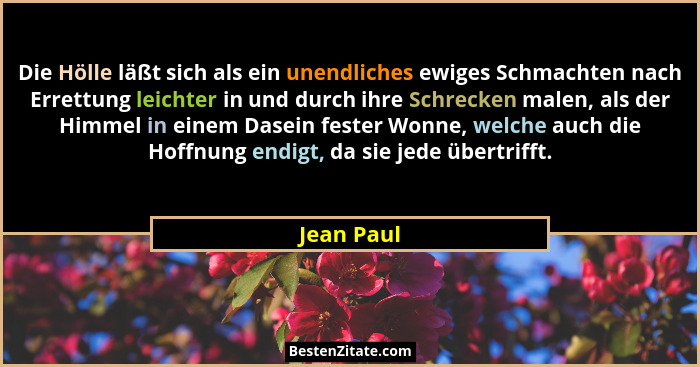 Die Hölle läßt sich als ein unendliches ewiges Schmachten nach Errettung leichter in und durch ihre Schrecken malen, als der Himmel in einem Dasein fester Wonne, welche auch die Hoffnung endigt, da sie jede übertrifft.