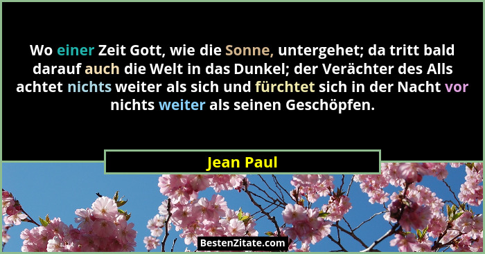 Wo einer Zeit Gott, wie die Sonne, untergehet; da tritt bald darauf auch die Welt in das Dunkel; der Verächter des Alls achtet nichts weiter als sich und fürchtet sich in der Nacht vor nichts weiter als seinen Geschöpfen.