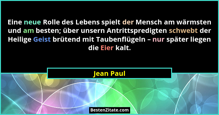 Eine neue Rolle des Lebens spielt der Mensch am wärmsten und am besten; über unsern Antrittspredigten schwebt der Heilige Geist brütend mit Taubenflügeln – nur später liegen die Eier kalt.