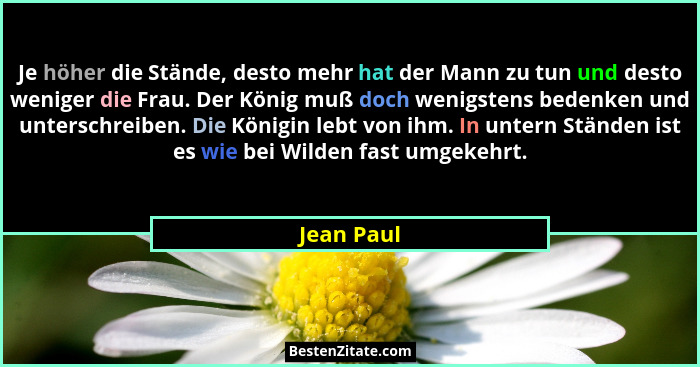 Je höher die Stände, desto mehr hat der Mann zu tun und desto weniger die Frau. Der König muß doch wenigstens bedenken und unterschreiben. Die Königin lebt von ihm. In untern Ständen ist es wie bei Wilden fast umgekehrt.