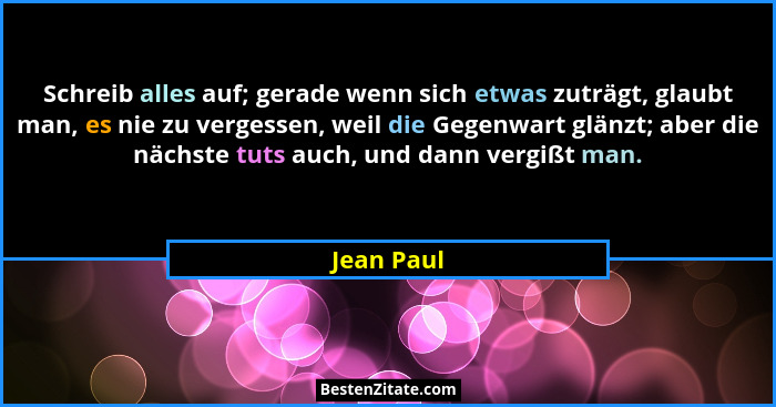 Schreib alles auf; gerade wenn sich etwas zuträgt, glaubt man, es nie zu vergessen, weil die Gegenwart glänzt; aber die nächste tuts auch, und dann vergißt man.