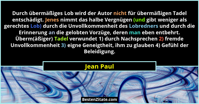 Durch übermäßiges Lob wird der Autor nicht für übermäßigen Tadel entschädigt. Jenes nimmt das halbe Vergnügen (und gibt weniger als gerechtes Lob) durch die Unvollkommenheit des Lobredners und durch die Erinnerung an die gelobten Vorzüge, deren man eben entbehrt. Überm(äßiger) Tadel verwundet 1) durch Nachsprechen 2) fremde Unvollkommenheit 3) eigne Geneigtheit, ihm zu glauben 4) Gefühl der Beleidigung.