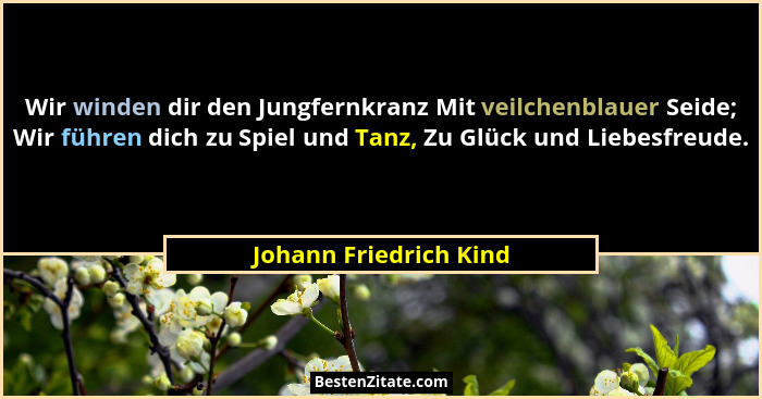 Wir winden dir den Jungfernkranz Mit veilchenblauer Seide; Wir führen dich zu Spiel und Tanz, Zu Glück und Liebesfreude.