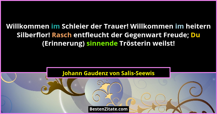 Willkommen im Schleier der Trauer! Willkommen im heitern Silberflor! Rasch entfleucht der Gegenwart Freude; Du (Erinnerung) sinnende Trösterin weilst!