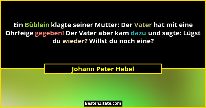 Ein Büblein klagte seiner Mutter: Der Vater hat mit eine Ohrfeige gegeben! Der Vater aber kam dazu und sagte: Lügst du wieder? Willst du noch eine?