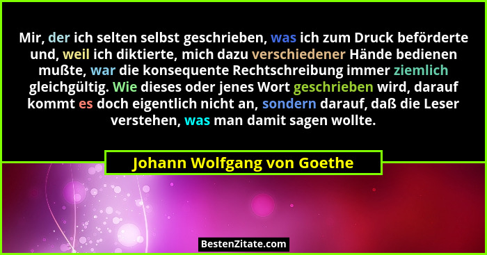 Mir, der ich selten selbst geschrieben, was ich zum Druck beförderte und, weil ich diktierte, mich dazu verschiedener Hände bedienen mußte, war die konsequente Rechtschreibung immer ziemlich gleichgültig. Wie dieses oder jenes Wort geschrieben wird, darauf kommt es doch eigentlich nicht an, sondern darauf, daß die Leser verstehen, was man damit sagen wollte.
