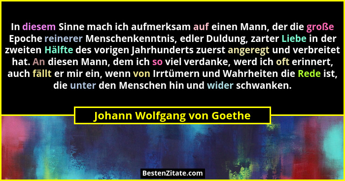 In diesem Sinne mach ich aufmerksam auf einen Mann, der die große Epoche reinerer Menschenkenntnis, edler Duldung, zarter Liebe in der zweiten Hälfte des vorigen Jahrhunderts zuerst angeregt und verbreitet hat. An diesen Mann, dem ich so viel verdanke, werd ich oft erinnert, auch fällt er mir ein, wenn von Irrtümern und Wahrheiten die Rede ist, die unter den Menschen hin und wider schwanken.