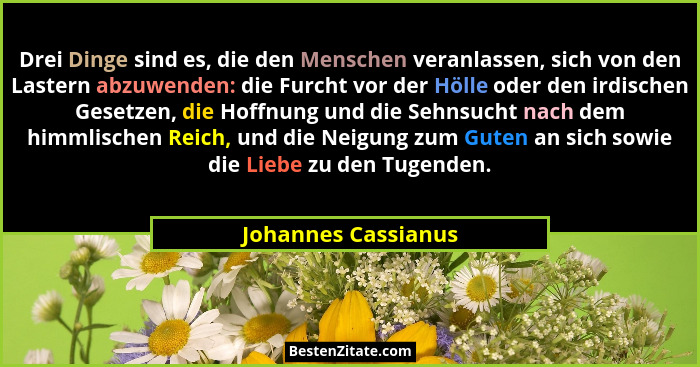 Drei Dinge sind es, die den Menschen veranlassen, sich von den Lastern abzuwenden: die Furcht vor der Hölle oder den irdischen Gesetzen, die Hoffnung und die Sehnsucht nach dem himmlischen Reich, und die Neigung zum Guten an sich sowie die Liebe zu den Tugenden.