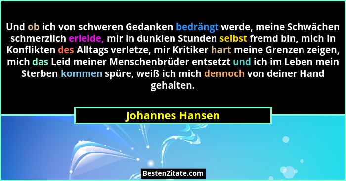 Und ob ich von schweren Gedanken bedrängt werde, meine Schwächen schmerzlich erleide, mir in dunklen Stunden selbst fremd bin, mich in Konflikten des Alltags verletze, mir Kritiker hart meine Grenzen zeigen, mich das Leid meiner Menschenbrüder entsetzt und ich im Leben mein Sterben kommen spüre, weiß ich mich dennoch von deiner Hand gehalten.