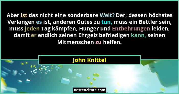 Aber ist das nicht eine sonderbare Welt? Der, dessen höchstes Verlangen es ist, anderen Gutes zu tun, muss ein Bettler sein, muss jeden Tag kämpfen, Hunger und Entbehrungen leiden, damit er endlich seinen Ehrgeiz befriedigen kann, seinen Mitmenschen zu helfen.