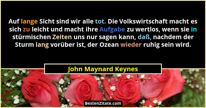 Auf lange Sicht sind wir alle tot. Die Volkswirtschaft macht es sich zu leicht und macht ihre Aufgabe zu wertlos, wenn sie in stürmischen Zeiten uns nur sagen kann, daß, nachdem der Sturm lang vorüber ist, der Ozean wieder ruhig sein wird.